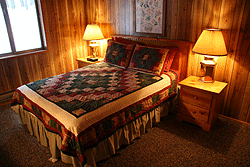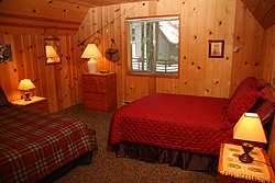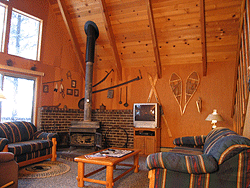 2 bath cabin sleeps eight and features a living room with a high-vaulted